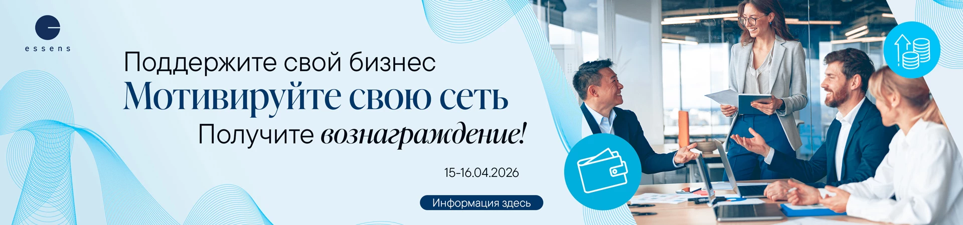 Станьте частью успешной международной компании и постройте собственный бизнес вместе с ESSENS! Мы предлагаем вам проверенную предпринимательскую возможность, которая позволит не только достичь финансовой независимости, но и вдохновлять других. Вместе с нами вы получите постоянную поддержку, профессиональное обучение и привлекательные вознаграждения, которые будут мотивировать вас к росту.